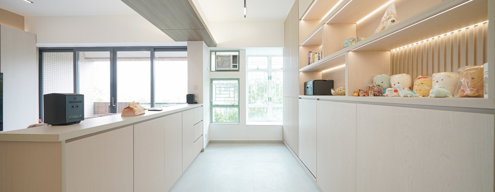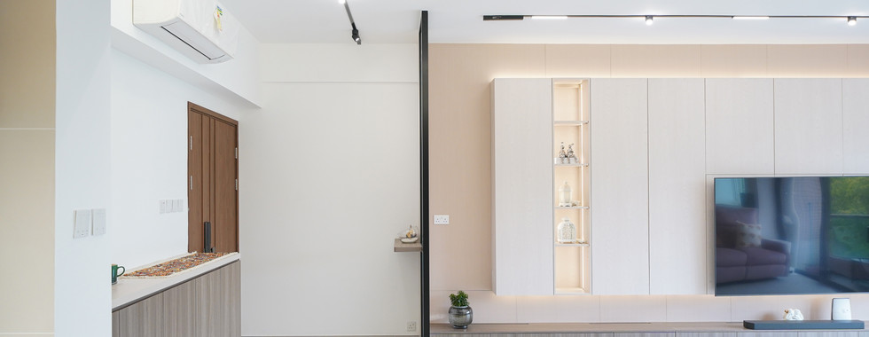 屋主希望門口玄關設立屏風,望增加私隱度及能緩衝傳統。設計師特以將屏風安排電視櫃側,唔需刻意再引伸部件,只需輕輕露出金屬框架連具私隱度嘅長虹玻璃即可。半透嘅玻璃令光線及屋內情況變得若隱若現,小層架更輕輕點絀屏風,輕巧又實用。屏風及電視櫃橫誇半屋,令客廳更整體又做到聰明人性化嘅設計!