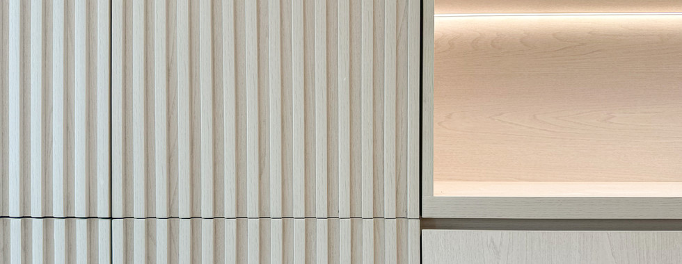 隨著屏風嘅設立,唔多唔少會影嚮咗客廳電視牆原先嘅細長視覺效果。想做到高儲物量又能顧及整個屋子的感觀,因此在設計電視櫃時運用了「修容法」,利用不同深淺度顏色去修正「肥矮」的牆身,重新將重點圈出。以較深嘅奶茶色作電視特色牆背板,再以淡奶油色將電視儲物櫃突顯出來,電視櫃嘅橫又長修正視覺比例,再將地櫃禁低「擺係地下」,成個客廳睇落修長、乾淨又簡約,冇累贅嘅線條或突兀嘅家具,俾人感覺十分舒服。