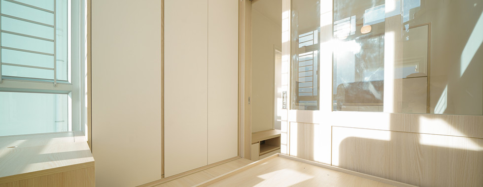 至於睡房空間就被推到屋內最入位置,靠窗而立。屋主表示希望能夠擺放大衣櫃、雙人床同書枱,因此設計師將睡房設計成地台床組合。