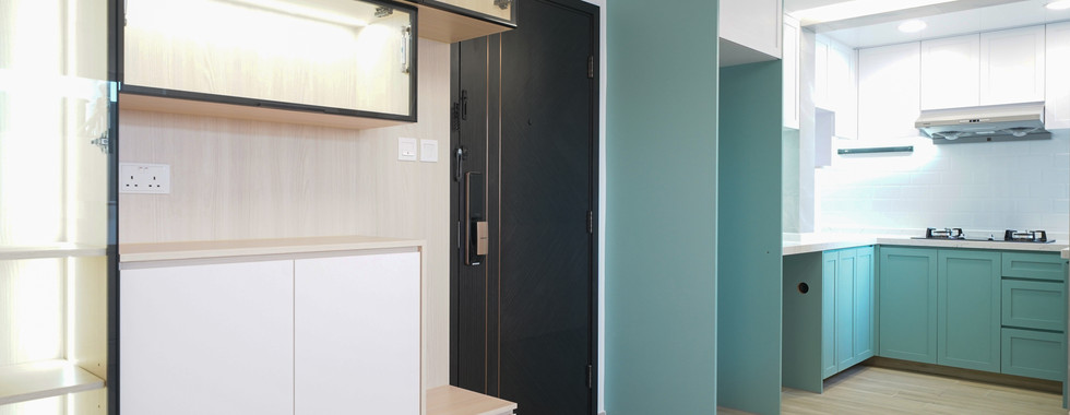 係設計上,屋主想突顯光鮮亮麗既感覺!廚房既一套鮮明薄荷綠歐陸風廚櫃成位屋子既重中之中😆屋主喜好入廚,日對夜對既廚房當然要揀自己喜愛既顏色!以薄荷綠溝白色既呢個配搭,將呢隻色使用得剛剛好,唔會因為使用過度而變得heavy,櫃身以簡單既邊框飾面打造出輕歐陸風。