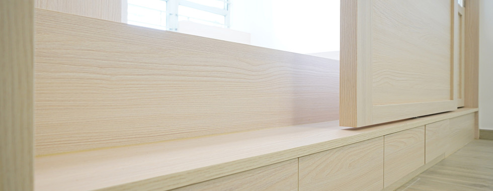 全屋使用淺白系列,打造明亮感,令光線可以係屋內繼續折射,以無印木色與白色混搭為主打,如廚房既白色暗磚設計、白雲石廚櫃檯面,再適當地使用淺灰色磚hightligh牆身,為屋內增加層次美。