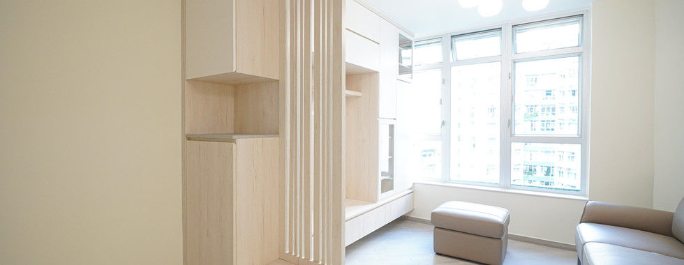 傳統上,大門對窗俾人感覺時好時壞,當然信就有唔信就冇囉😉!不過小編就覺得,打開門俾街坊睇到晒屋入面既大大細細就唔係咁開心喇~ 有d野擋一擋「見光位」都唔錯吖!因此設計師係佈局安排上,都特意預留位置係玄關處,設立一個換鞋專區連小屏風,除左擺放鞋外,仲有枱面放置鎖匙、以及換鞋櫈。